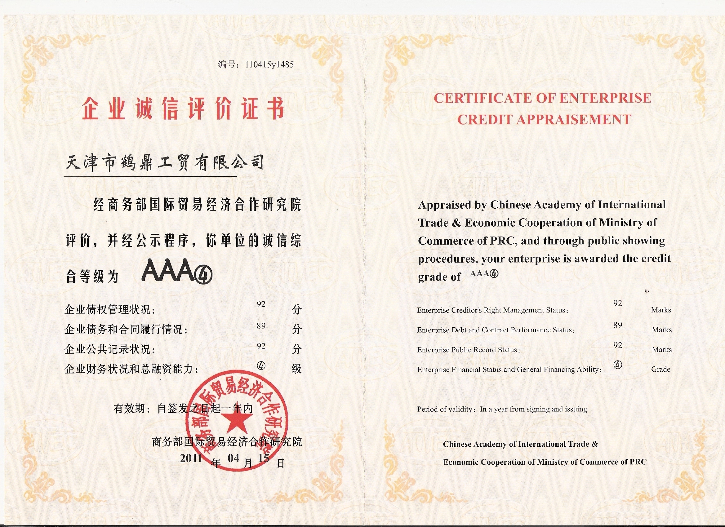 企業(yè)誠信評價證書